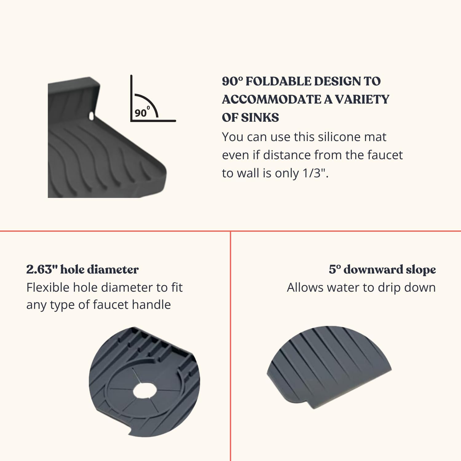 - KEEPS WATER OFF YOUR COUNTERTOPS: The kitchen sink splash guard has a 5° downward slope and raised drain channels that guide water into the sink, not onto your counters or behind the faucet.