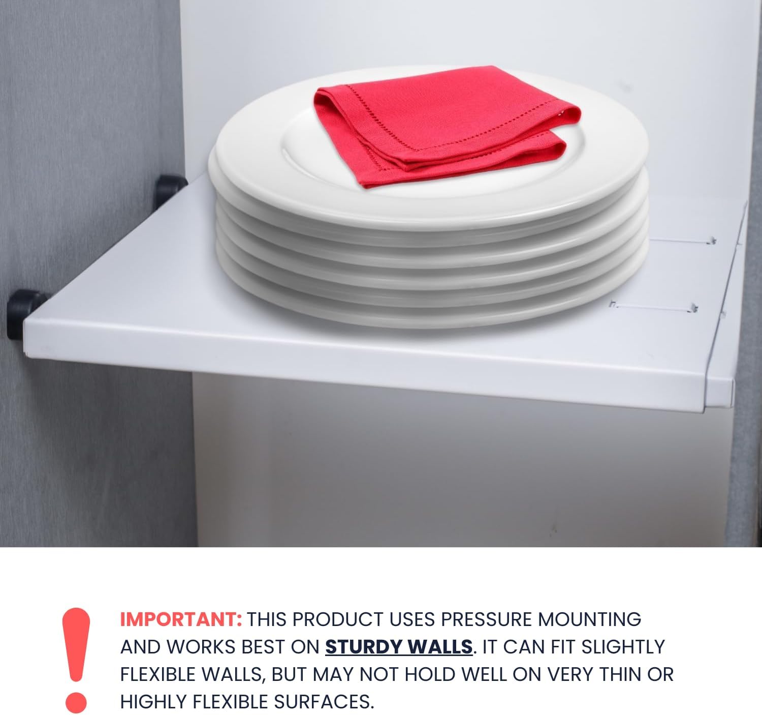 - No Drilling, No glue: This innovative tension shelf for cabinet, cupboard or pantry offers a stable and secure fit without the need for screws, making it an ideal no screw adjustable cabinet shelf for renters and homeowners alike. Just set the adjustable cupboard shelf as desired width, lock it into place and adjust the thumb screws to secure the fit. Patent Pending 63/655,097