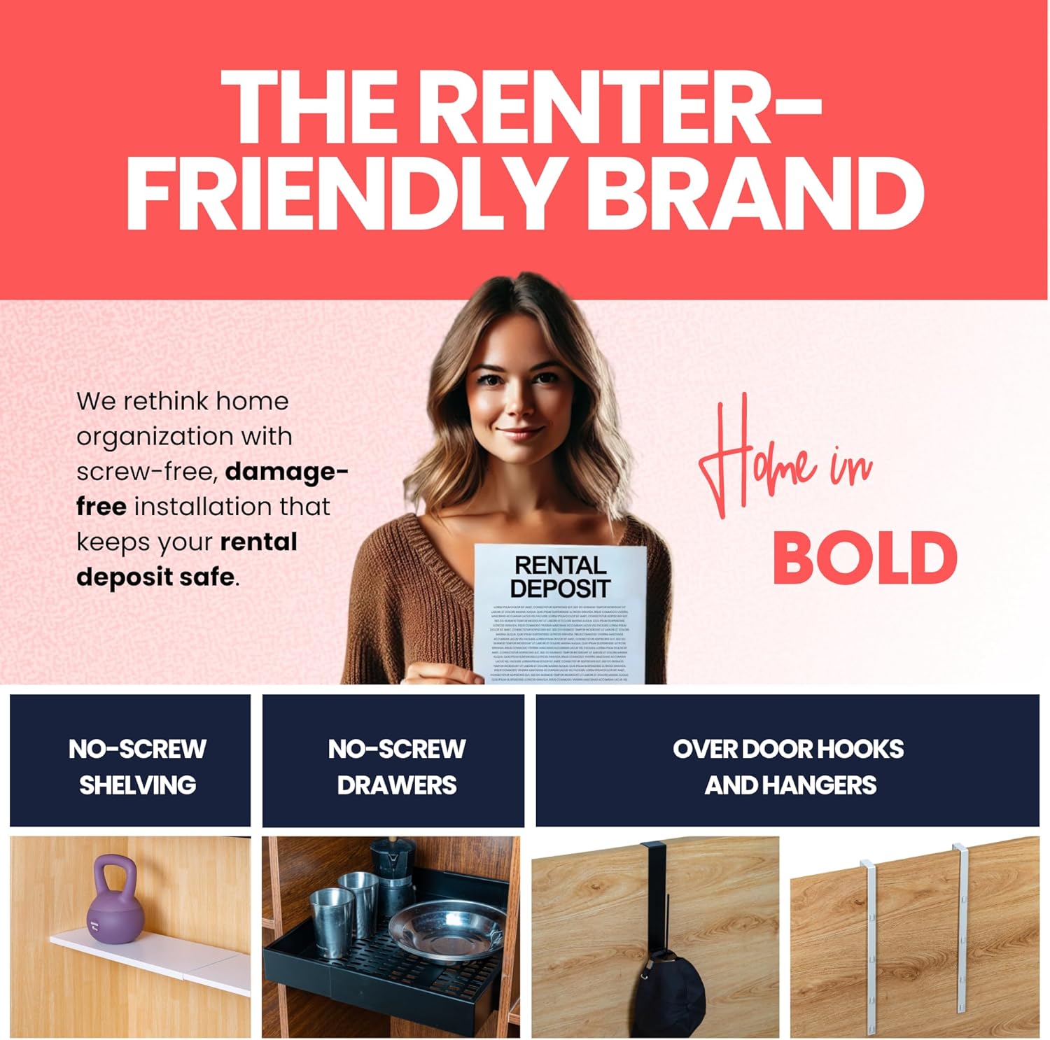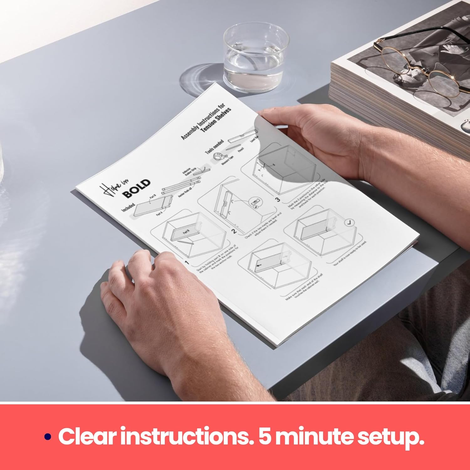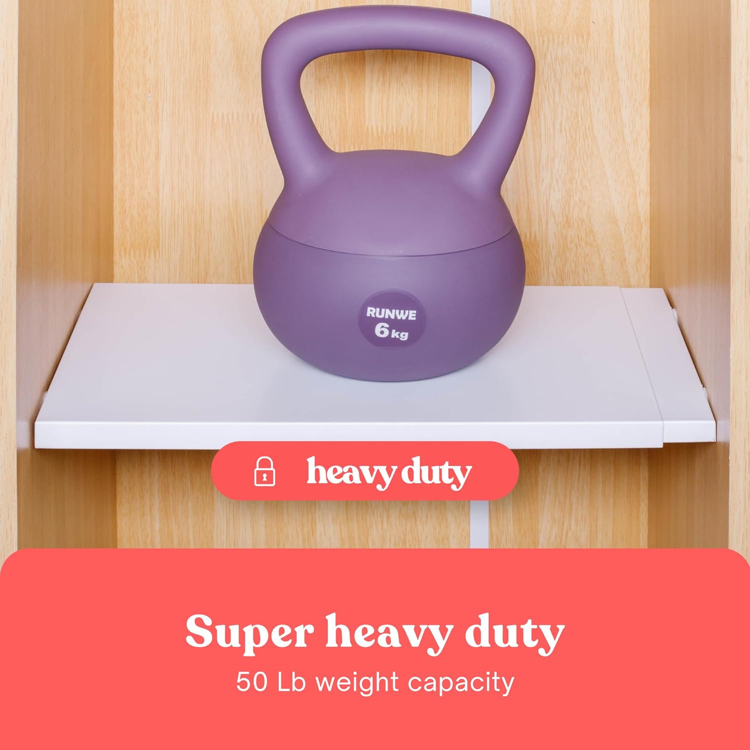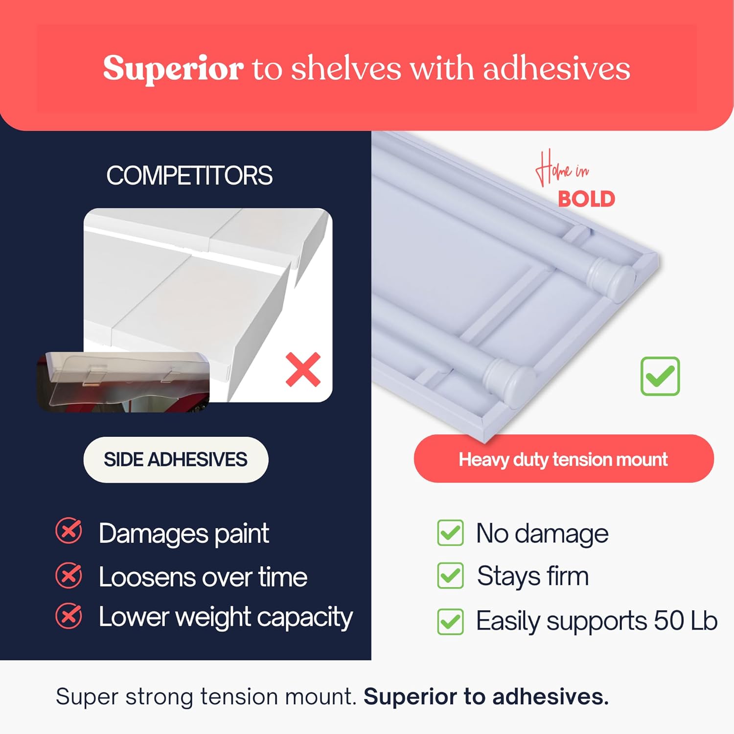 - NO DRILLING, NO GLUE: This innovative tension shelf for cabinet, cupboard or pantry offers a stable and secure fit without the need for screws, making it an ideal no screw adjustable cabinet shelf for renters and homeowners alike. Just set the tension rods at the desired width and place the shelf on top.