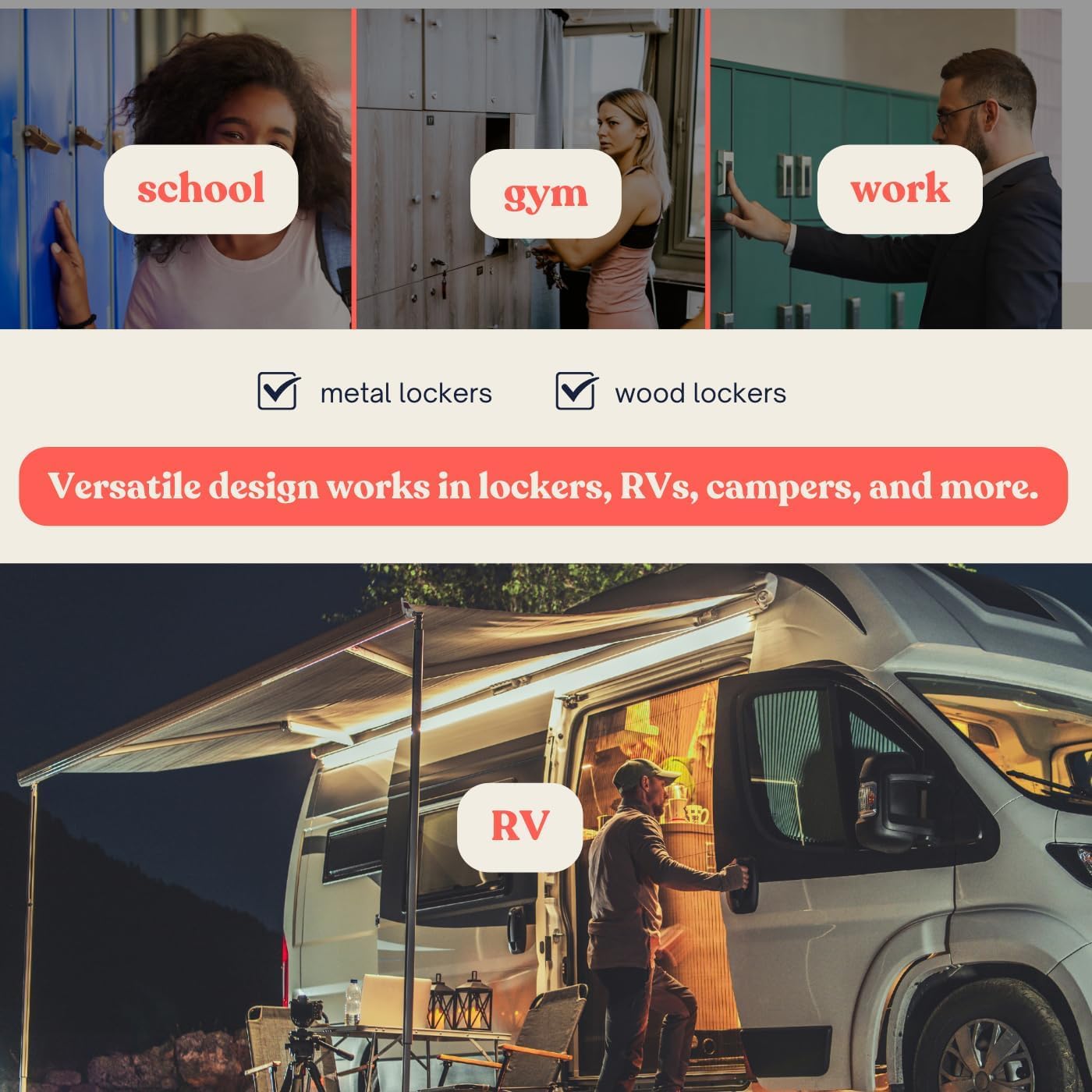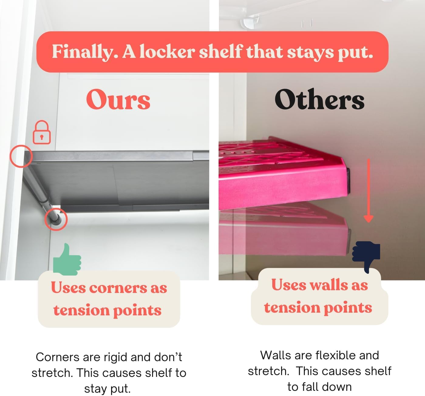 - Perhaps The Only Locker Shelf That really Stays Put: Unlike other locker shelves that slide down or wobble, this shelf uses a unique tension rod system that grips securely to locker corners rather than just the locker walls, ensuring it stays firmly in place. Metal locker walls are often flexible, and even with a lot of pressure on them, they will stretch. This cause other locker shelves that rely on wall pressure, to slide down.