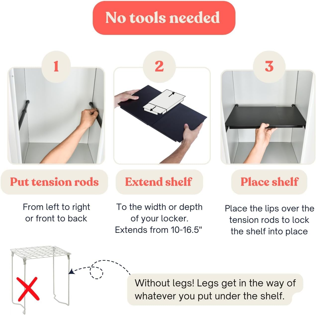 - 30 Second Tool-Free Setup: Place the tension rods on each side of the locker, then extend the shelf and put it over the rods. It’s that simple. Buying this for your little one to take to school? He or she will be able to install it alone, no problem!